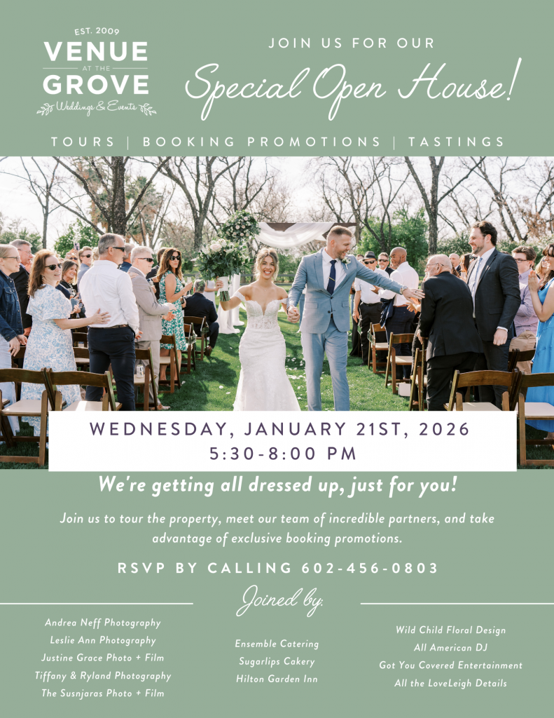 Looking for the perfect wedding venue for your big day? Come tour Venue at the Grove and start planning your wedding! During our special open house, you’ll be able to see your vision come to life right before your eyes! So come join us, and say yes to the venue where you’ll be creating everlasting memories! RSVP NOW!