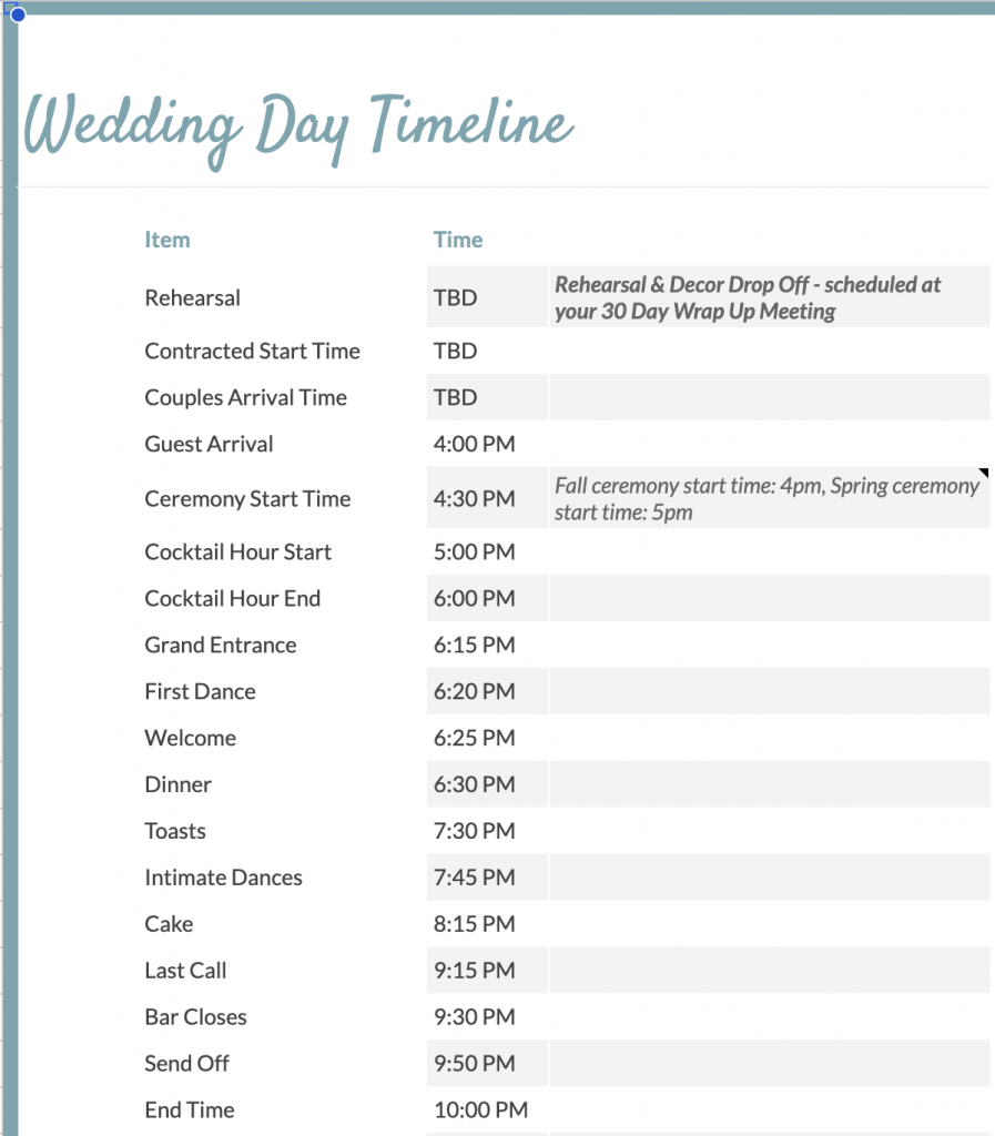 This is especially helpful for things like the rehearsal, family photos (especially if you’re doing them before the ceremony), and even after the ceremony when guests and wedding party members tend to wander off. A quick glance at the timeline keeps everyone in the right place at the right time.